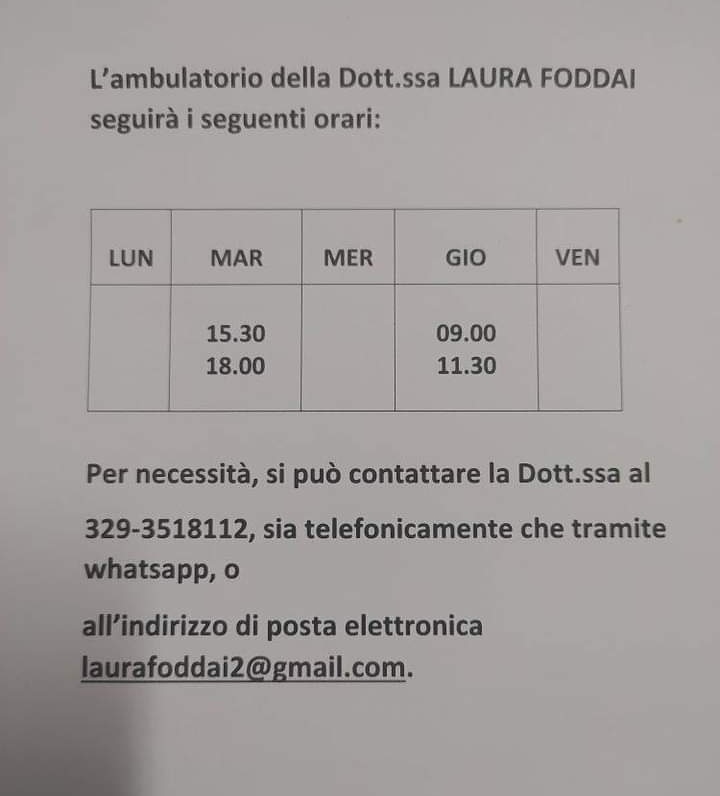 La Dottoressa Foddai comunica i nuovi orari dell’ambulatorio