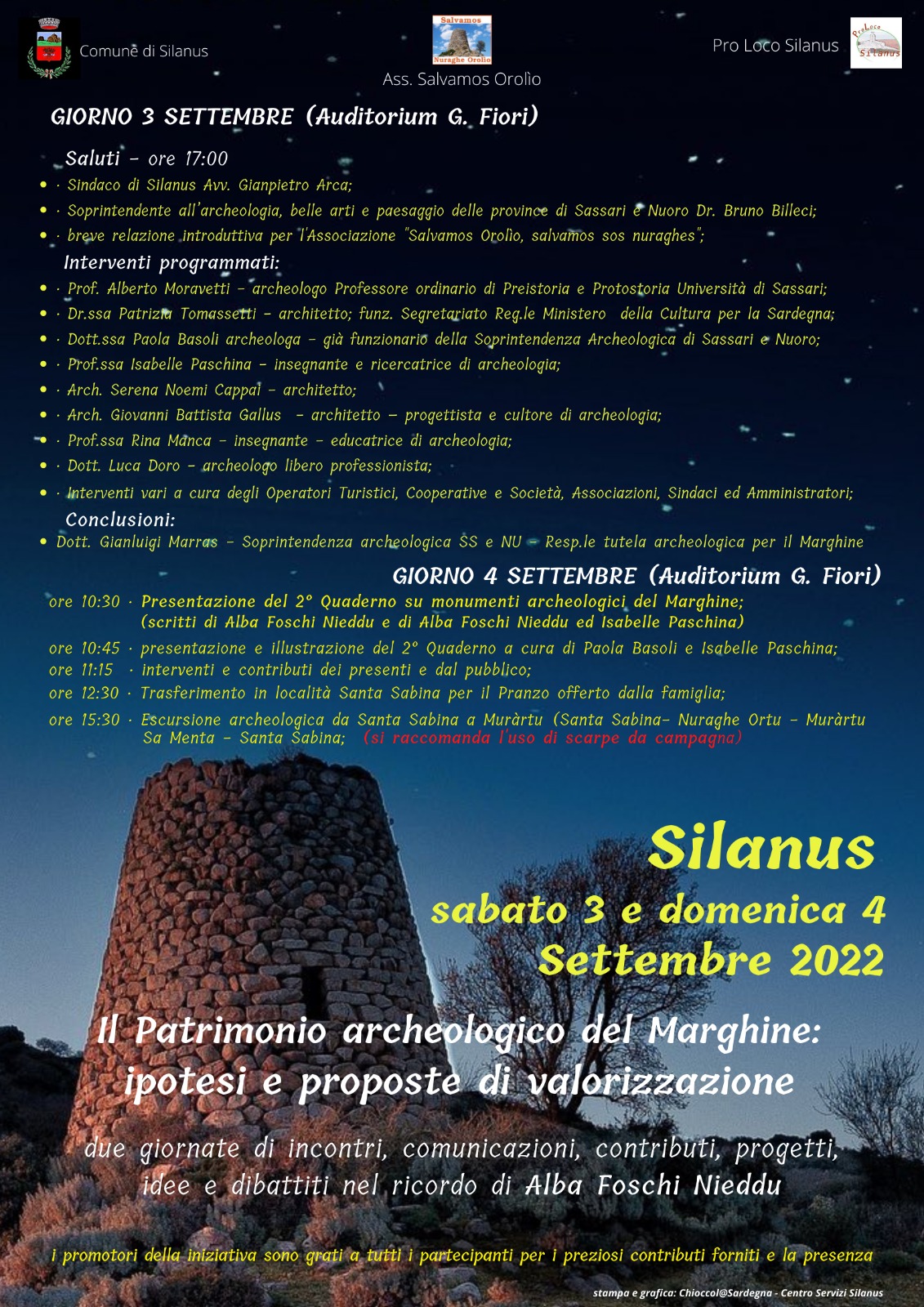 L’Associazione “Salvàmos Orolìo – Salvàmos sos Nuraghes” ha organizzato per il 3 e 4 settembre due giornate di incontri, contributi, progetti, idee e dibattiti in ricordo di Alba Foschi Nieddu, con l’obiettivo di risvegliare l’attenzione e l’interesse del territorio per il suo prezioso patrimonio storico e riprendere insieme il discorso della sua valorizzazione.
