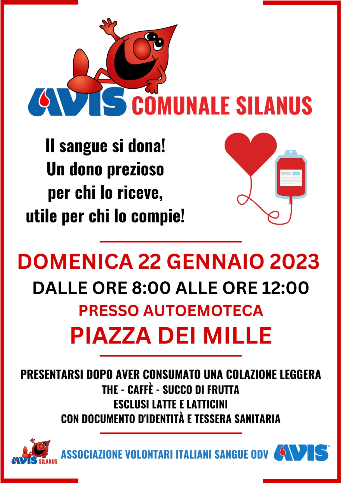 Domenica 22 gennaio, a partire dalle ore 8.00 fino alle ore 12.00, in piazza dei Mille, i volontari dell’Avis di Silanus saranno a disposizione di tutti coloro che vorranno fare un gesto di solidarietà donando il sangue.