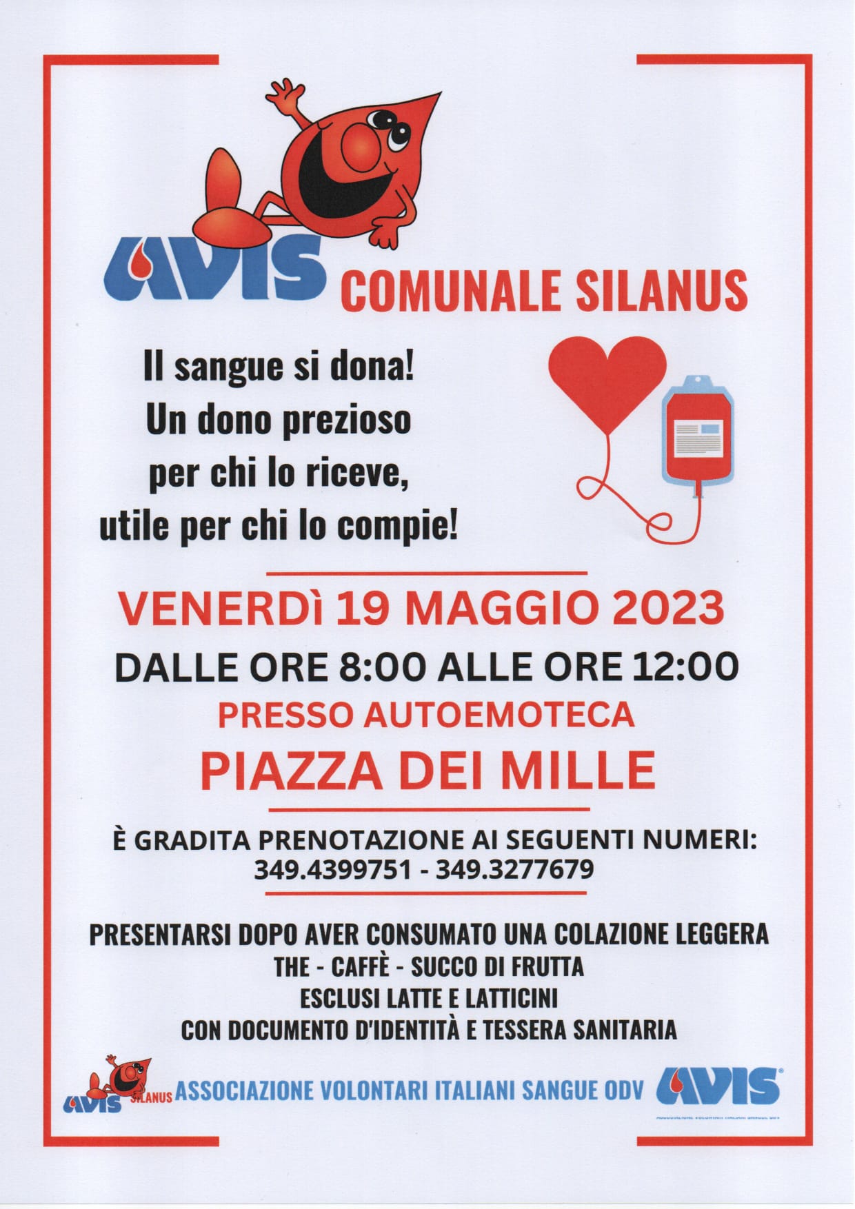 Venerdì 19 maggio, a partire dalle ore 8.00 fino alle ore 12.00, presso l’Autoemoteca in piazza dei Mille, i volontari dell’Avis di Silanus saranno a disposizione di tutti coloro che vorranno fare un gesto di solidarietà donando il sangue.