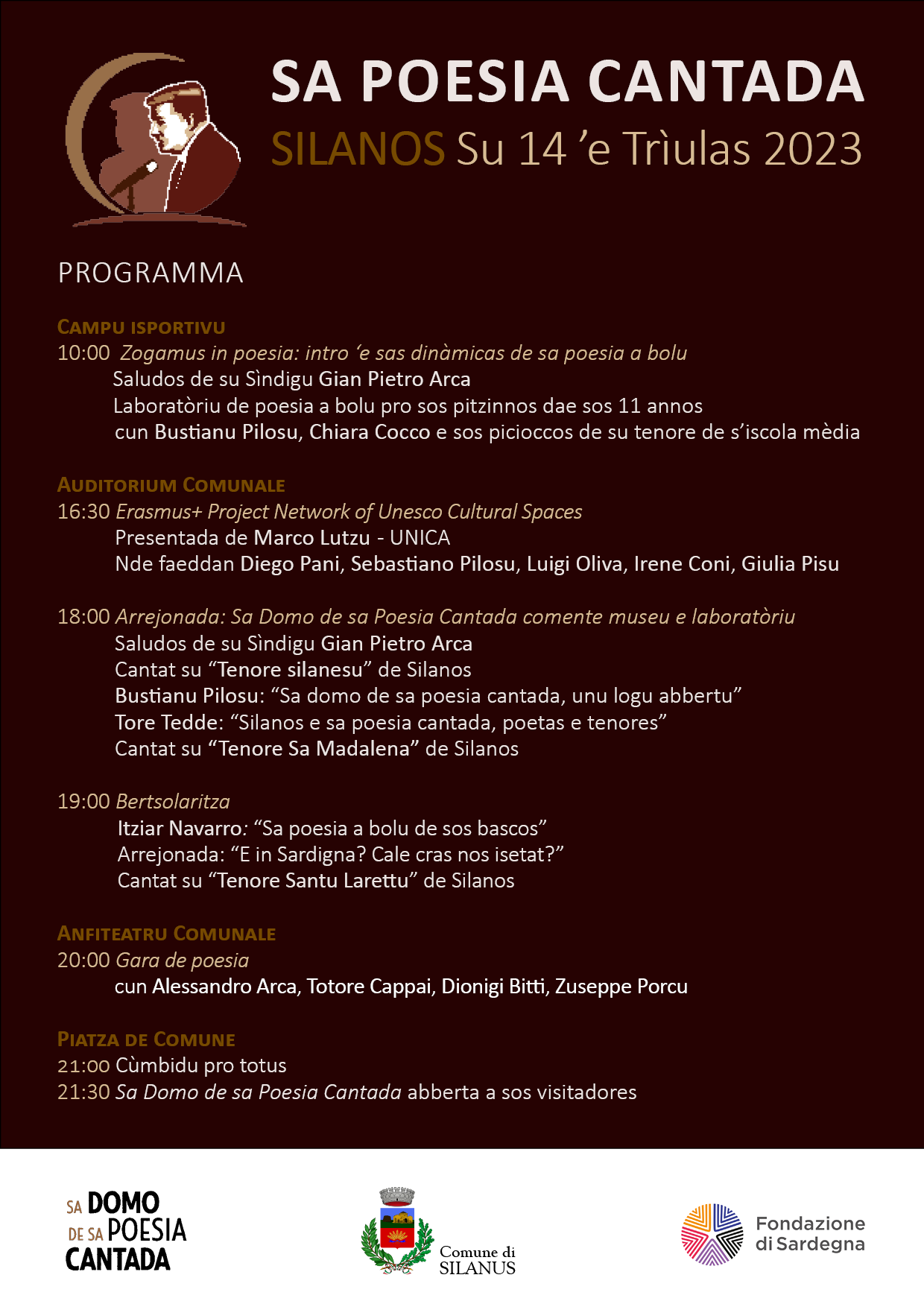 La giornata si concluderà con il momento della gara poetica nell’Anfiteatro comunale e con la visita a “Sa domo de sa poesia cantada”, uno spazio museale e culturale unico nel suo genere, dedicato all’arte poetica estemporanea, che per l’occasione seguirà i seguenti orari di apertura: 16:00-18:00 | 20:00-23:00.
