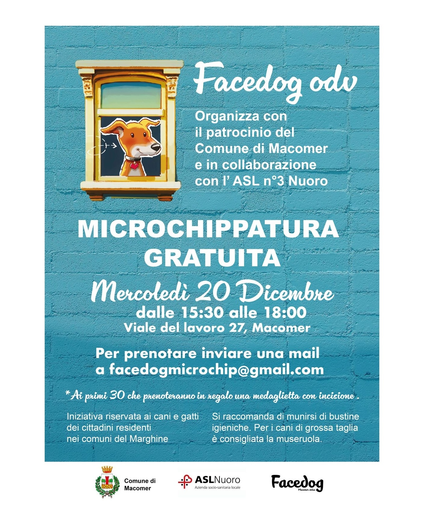 L’Associazione Facedog ODV, con il patrocinio del Comune di Macomer e in collaborazione con la ASL n. 3 Nuoro, organizza la Giornata della Microchippatura gratuita, fissata per mercoledì 20 dicembre a partire dalle ore 15:30 e fino alle ore 18:00 in Viale del Lavoro n.27 a Macomer.