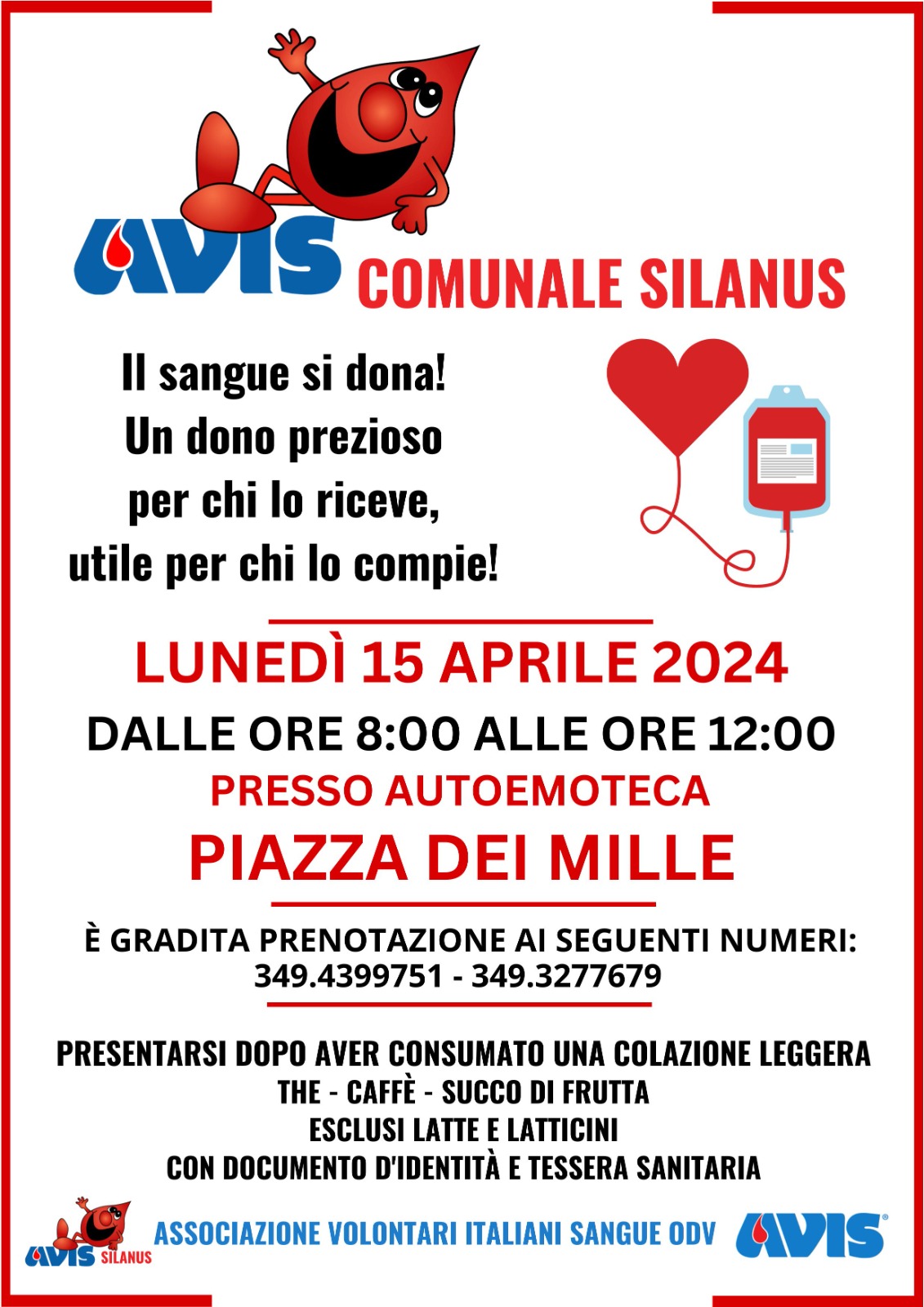 Lunedì 15 aprile, a partire dalle ore 8.00 fino alle ore 12.00, presso l’Autoemoteca in piazza dei Mille, i volontari dell’Avis di Silanus saranno a disposizione di tutti coloro che vorranno fare un gesto di solidarietà donando il sangue.