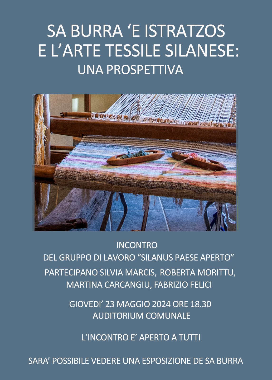 Giovedì 23 maggio alle ore 18:30 presso l’Auditorium Comunale si terrà un incontro dal titolo “Sa burra ‘e istratzos e l’arte tessile silanese: una prospettiva”. La comunità incontrerà esperti del settore per confrontarsi su come tutelare e promuovere questo prodotto artigianale tipico del nostro paese in un’ottica di crescita del territorio.