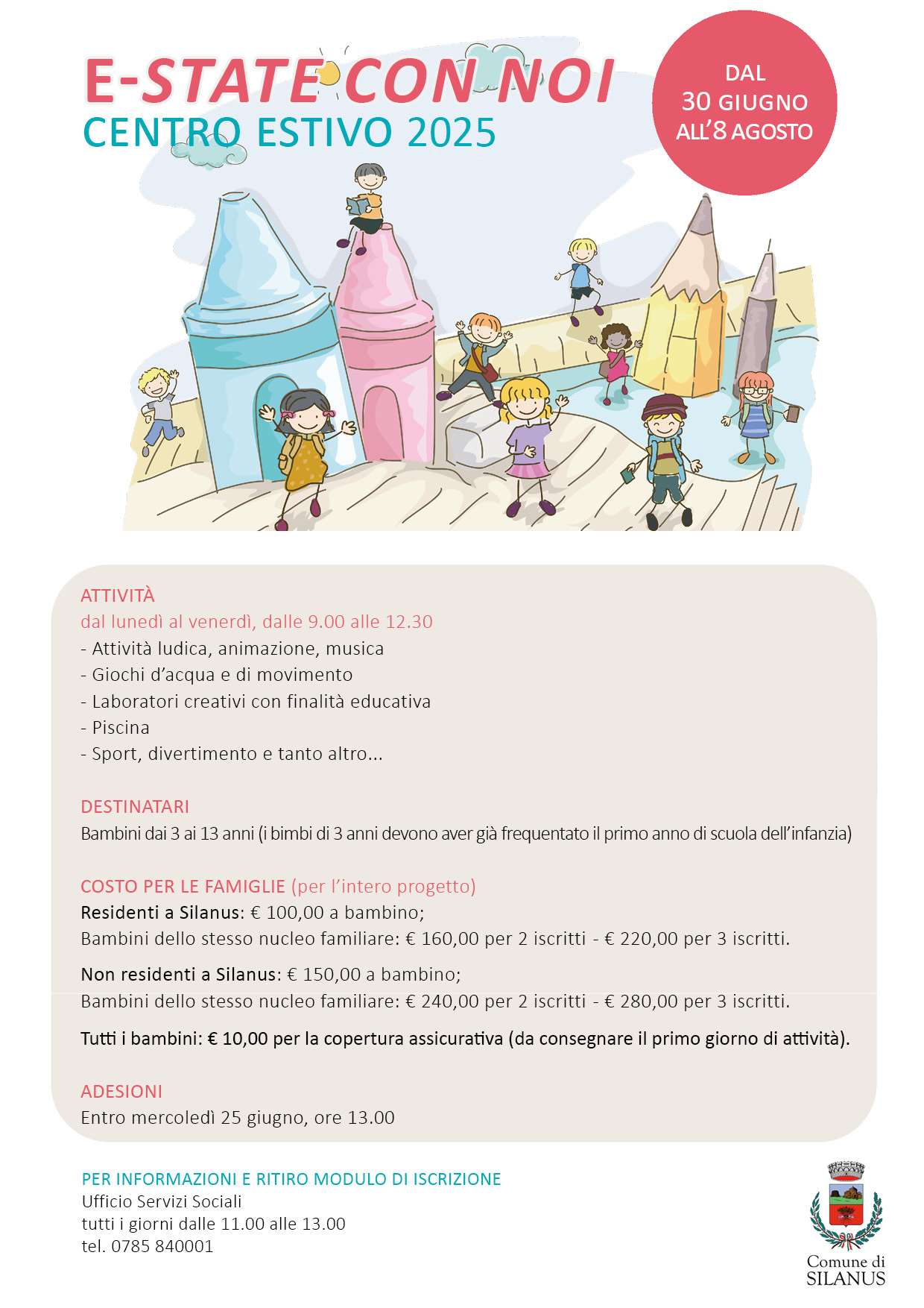 Il centro estivo sarà operativo dal lunedì al venerdì, dalle 9.00 alle 12.30 con attività ludiche, di animazione, musica, piscina, giochi d’acqua e di movimento, laboratori creativi con finalità educativa e tante altre iniziative divertenti.
